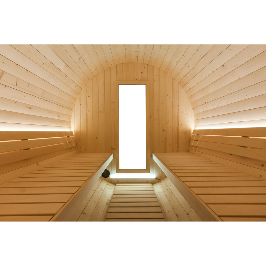 De sauna is vervaardigd uit massief vurenhout en afgewerkt met een luxe lindehouten interieur. Binnenin vind je twee comfortabele banken, ergonomische rugleuningen en een tweedelig vloerrooster, wat zorgt voor een ontspannen zithouding en een goede luchtcirculatie. De geïntegreerde dimbare witte LED-strip (76 cm) creëert een rustgevende sfeer. Voor extra beleving is de Kuusi-serie optioneel uit te breiden met LED-kleurenverlichting.