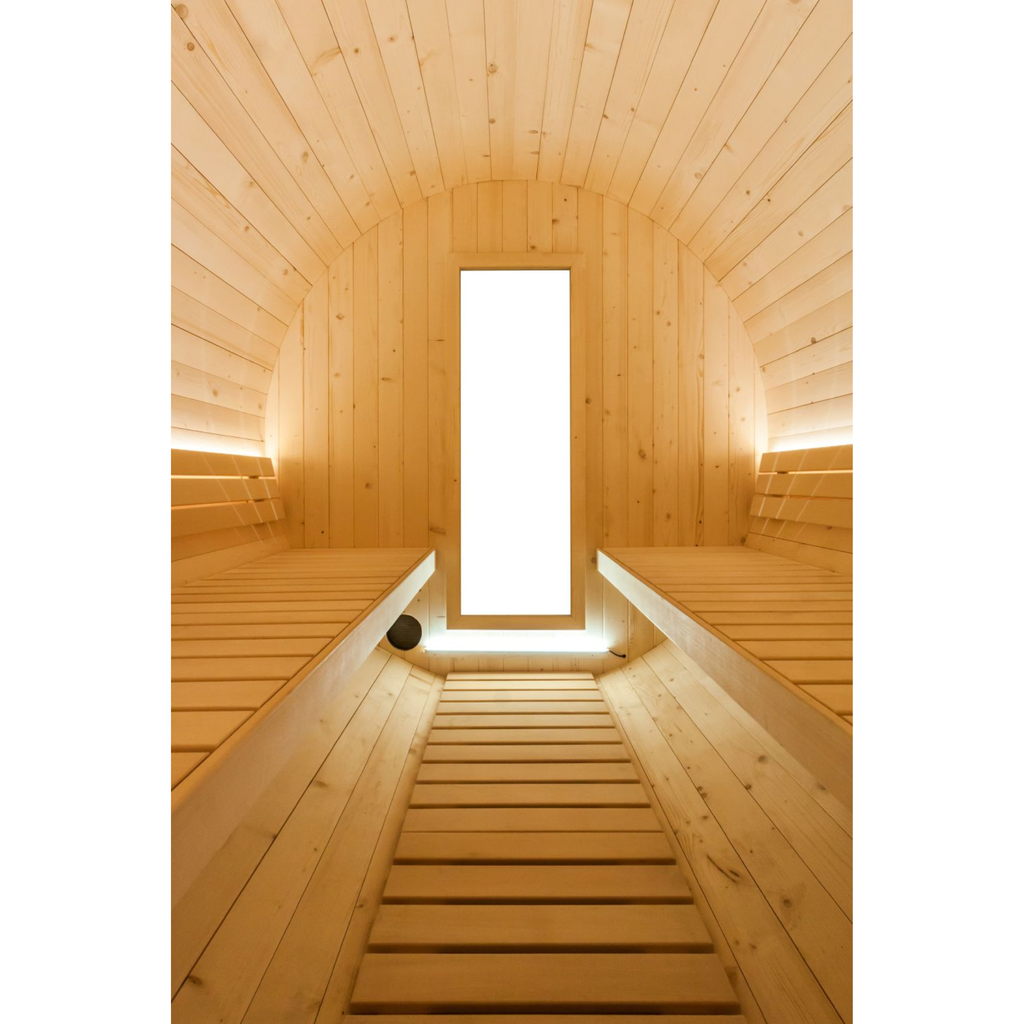 De sauna is vervaardigd uit massief vurenhout en afgewerkt met een elegant lindehouten interieur. Binnenin geniet je van twee comfortabele banken, ergonomische rugleuningen en een tweedelig vloerrooster, wat zorgt voor optimaal zitcomfort en een goede luchtcirculatie. De dimbare witte LED-strip (76 cm) creëert een rustgevende sfeer en kan optioneel worden uitgebreid met LED-kleurenverlichting voor extra beleving.