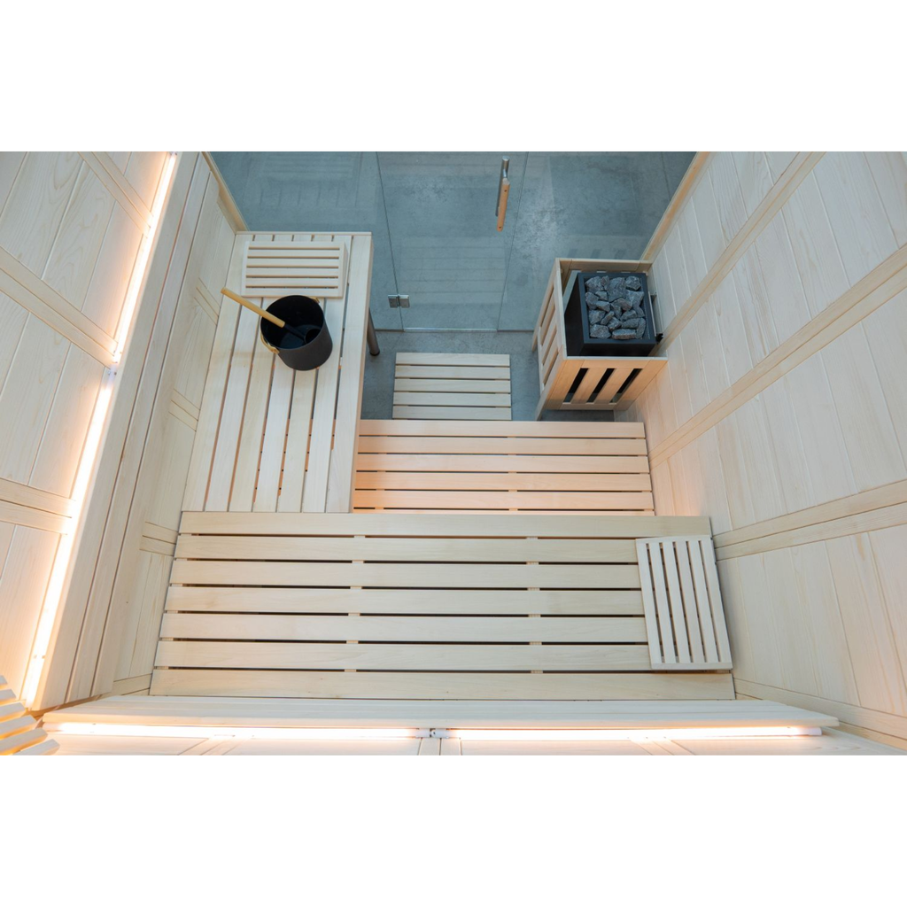 De sauna is uitgerust met drie comfortabele banken, ergonomische rugleuningen en twee hoofdsteunen, zodat je optimaal kunt genieten van elke saunasessie. De grote veiligheidsglas deur en de heldere glaselementen zorgen voor een open, moderne uitstraling en versterken het ruimtelijke gevoel. Voor extra veiligheid is de cabine voorzien van een kachelbeschermingsrooster, een vloerrooster en een ventilatiesleuf voor een goede luchtcirculatie.