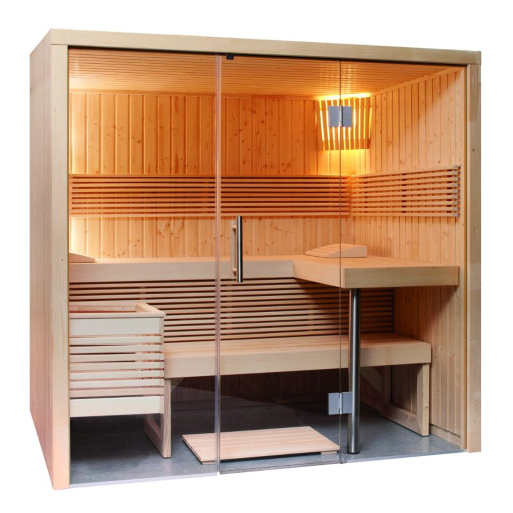 De sauna is vervaardigd uit onbehandeld vurenhout met een geschaafde afwerking, wat zorgt voor een warme en natuurlijke uitstraling. De enkele glazen deur van gehard glas geeft de cabine een open en moderne look, terwijl het interieur rust en comfort uitstraalt. De lindehouten banken op twee niveaus bieden prettig zit- en ligcomfort en maken het eenvoudig om te kiezen tussen verschillende warmtezones.