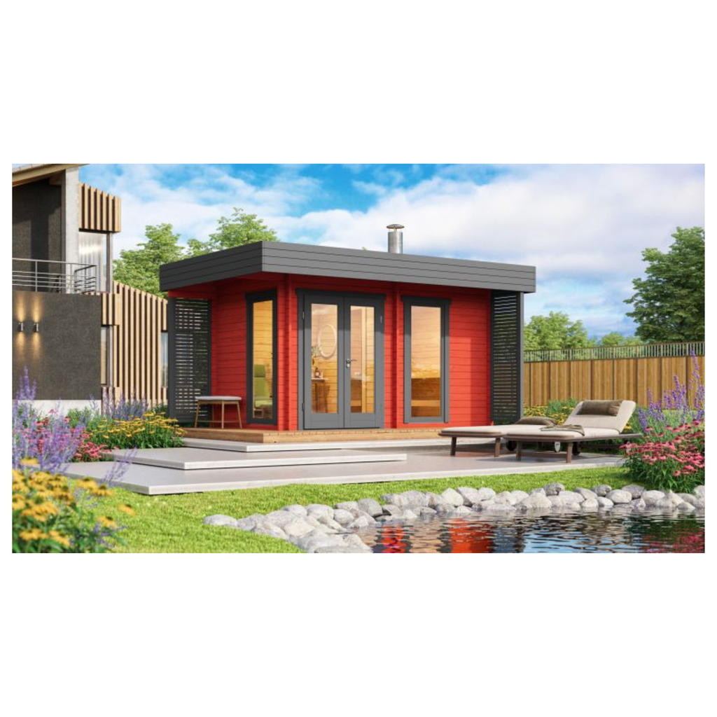 Binnenin is de saunaruimte uitgerust met saunabanken op twee niveaus van elzenhout, waardoor je eenvoudig kunt kiezen tussen verschillende warmtezones. Het platte dak met vuren dakbeschot geeft het saunahuis een moderne uitstraling; dakbedekking is optioneel te kiezen naar wens.