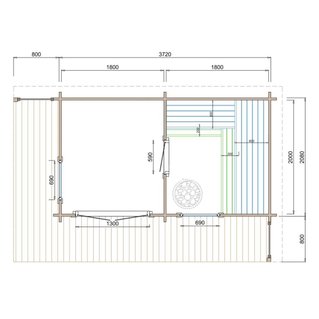 Het Saunahuis Inari wordt compleet geleverd met fundering en houten vloer, zodat een stabiele en duurzame plaatsing gegarandeerd is. De saunakachel is niet inbegrepen, waardoor je volledige vrijheid hebt in de keuze tussen een elektrische of houtgestookte kachel.