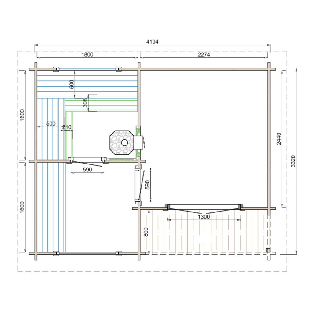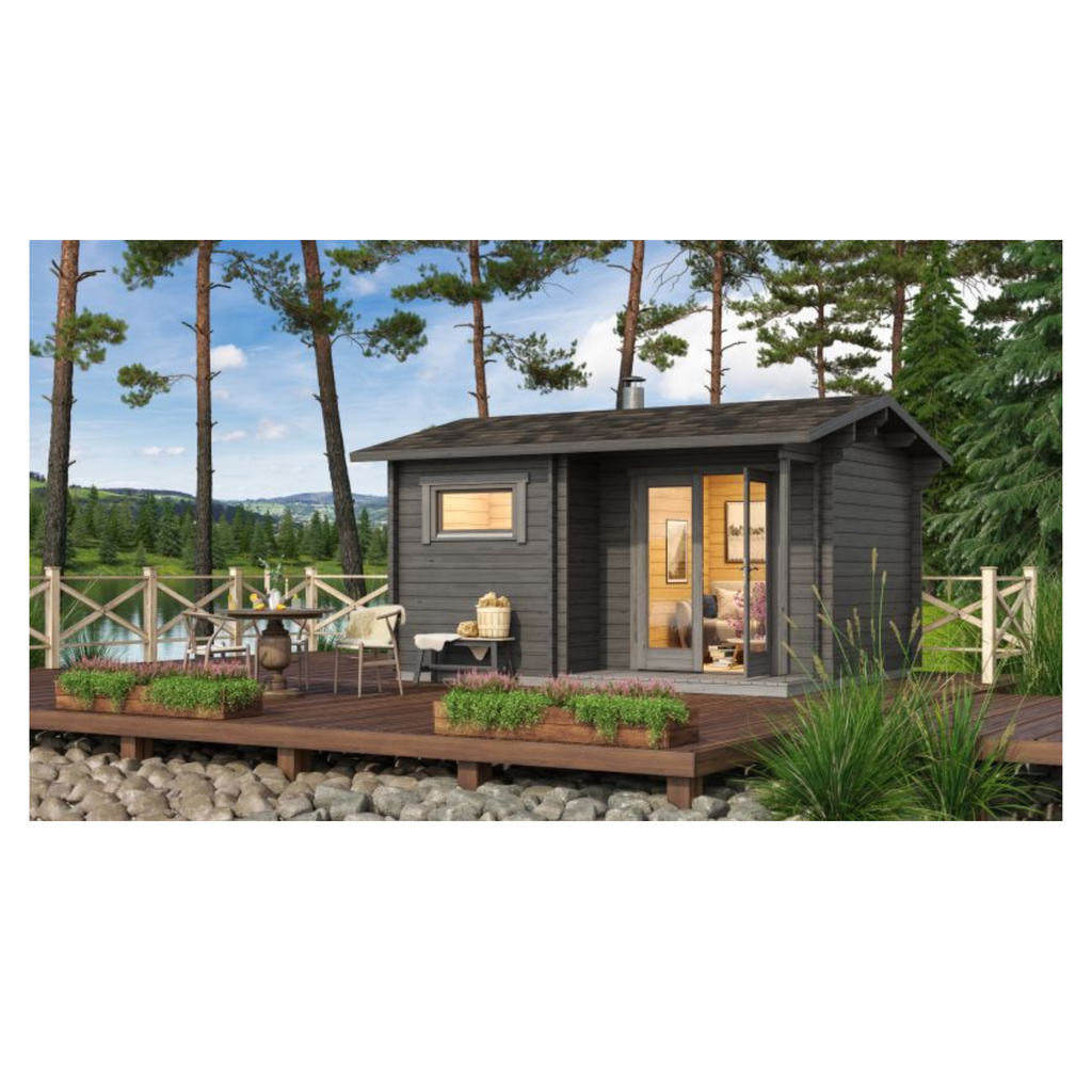 Het Saunahuis Juuka wordt compleet geleverd met fundering en houten vloer voor een stabiele plaatsing. De saunakachel is niet inbegrepen, waardoor je volledige vrijheid hebt in de keuze voor een elektrische of houtgestookte kachel, afgestemd op jouw wensen.