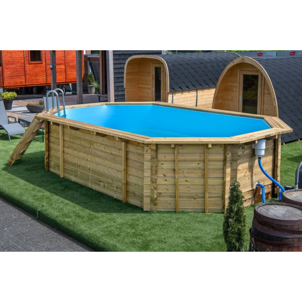 Het zwembad wordt compleet geleverd met liner, bevestigingsmaterialen, bouwtekening, filterzand, geotextiel, inlaat, pomp, skimmer en zandfilter, zodat je direct aan de slag kunt. De stevige houten ombouw met een wanddikte van 45 mm geeft het geheel een luxe uitstraling en lange levensduur.