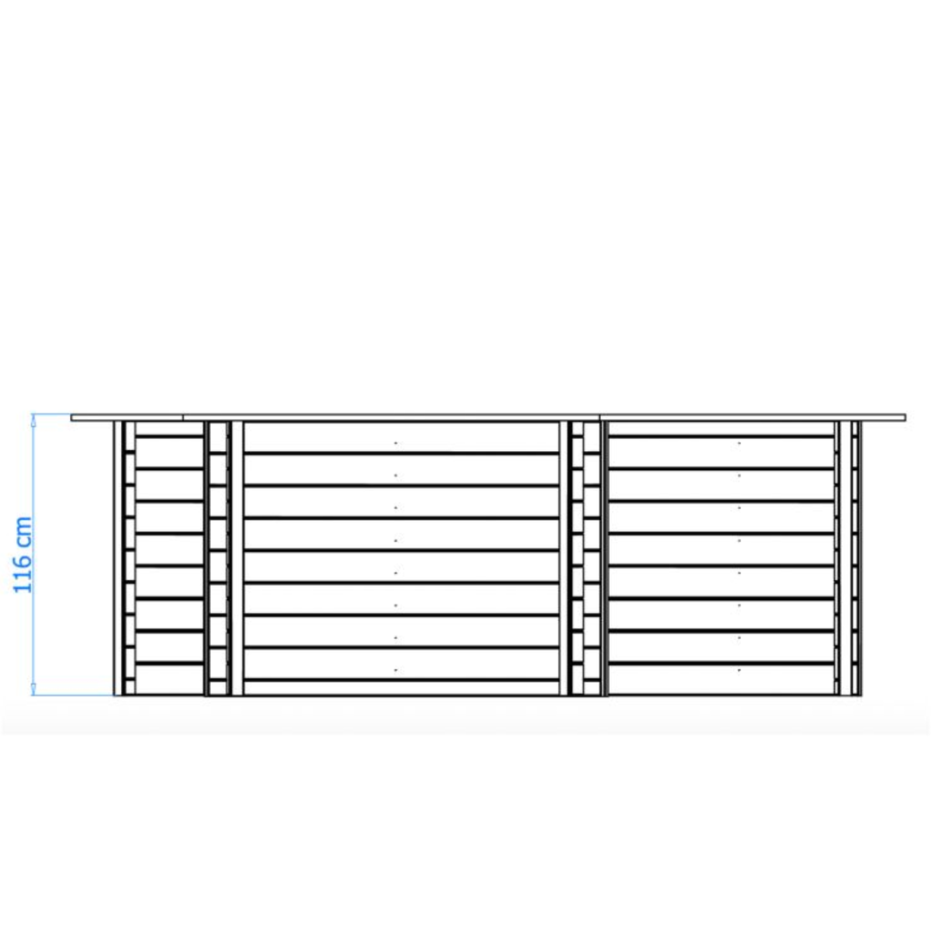 Het zwembad wordt compleet geleverd met liner, bevestigingsmaterialen, bouwtekening, filterzand, geotextiel, inlaat, pomp, skimmer en zandfilter, zodat je direct kunt beginnen met installeren. De stevige houten ombouw met een wanddikte van 45 mm geeft het zwembad een luxe en tijdloze uitstraling.